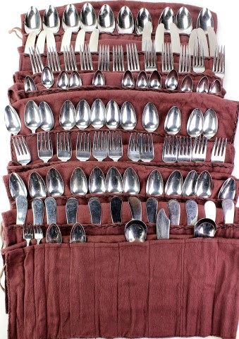 12 forks, knives, soup spoons, butter knives, sugar spoons, salad forks, 24 spoons, 1 large butter knife, 2 teaspoons, 2 pickle forks and 2 sugar spoons. Frawley Estate item. Est. 25-75