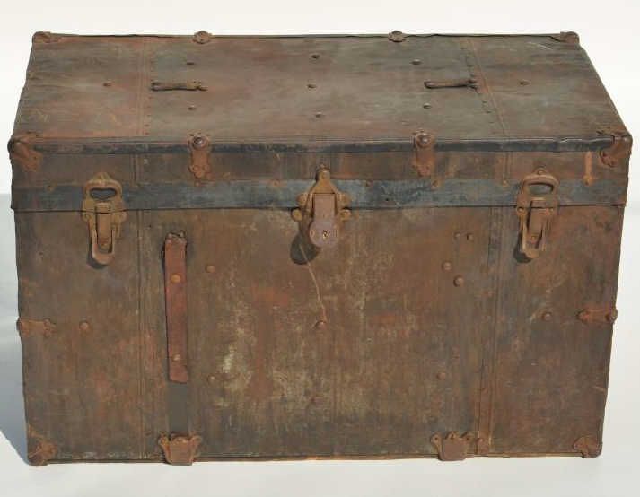 Large steamer trunk with metal enforcements and heavy construction from turn-of-the-century to 1920 showing aging and breaks to leather straps. Measures 30” x 16 1/2”. Gale and Kim Kennedy Collection Est.: $100-$200.