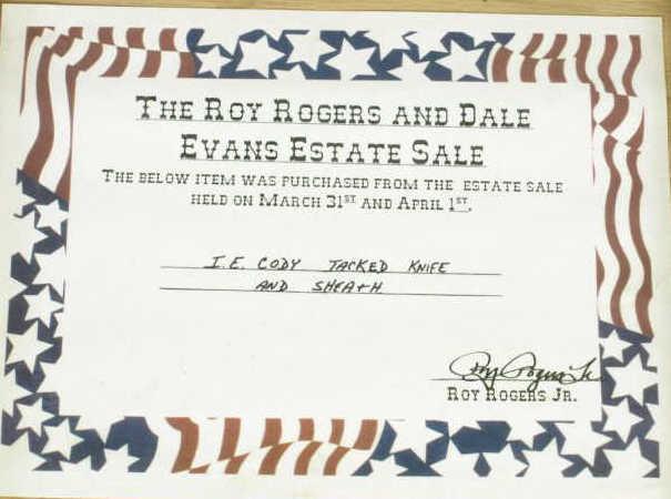having belonged to Iron Eyes Cody, most remembered for his television commercial against littering and pollution in the 1960's-1970's. From the Roy Rogers and Dale Evans estate sale and includes letter of provenance signed by Roy Rogers Jr. Knife measures 15", includes custom display case.