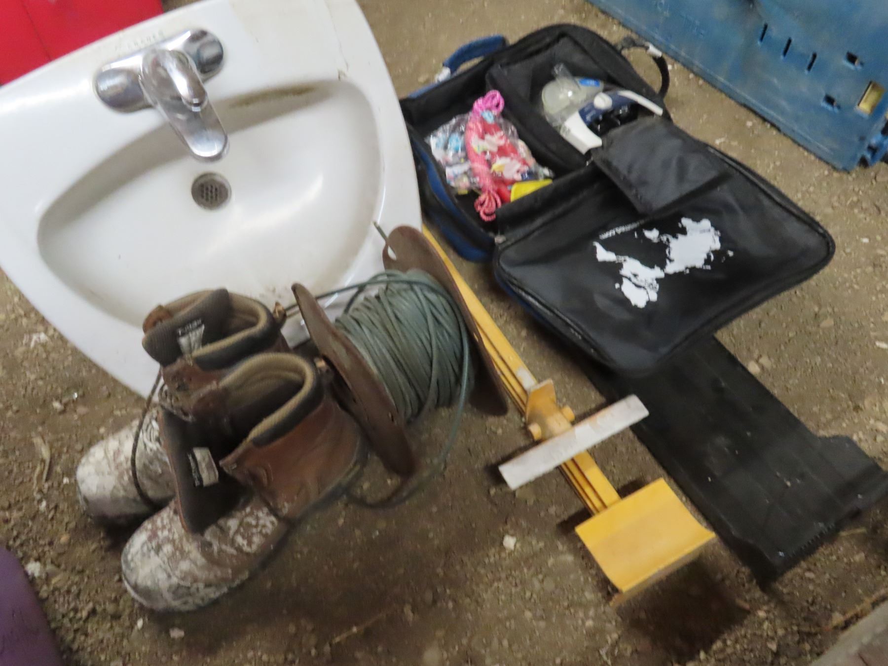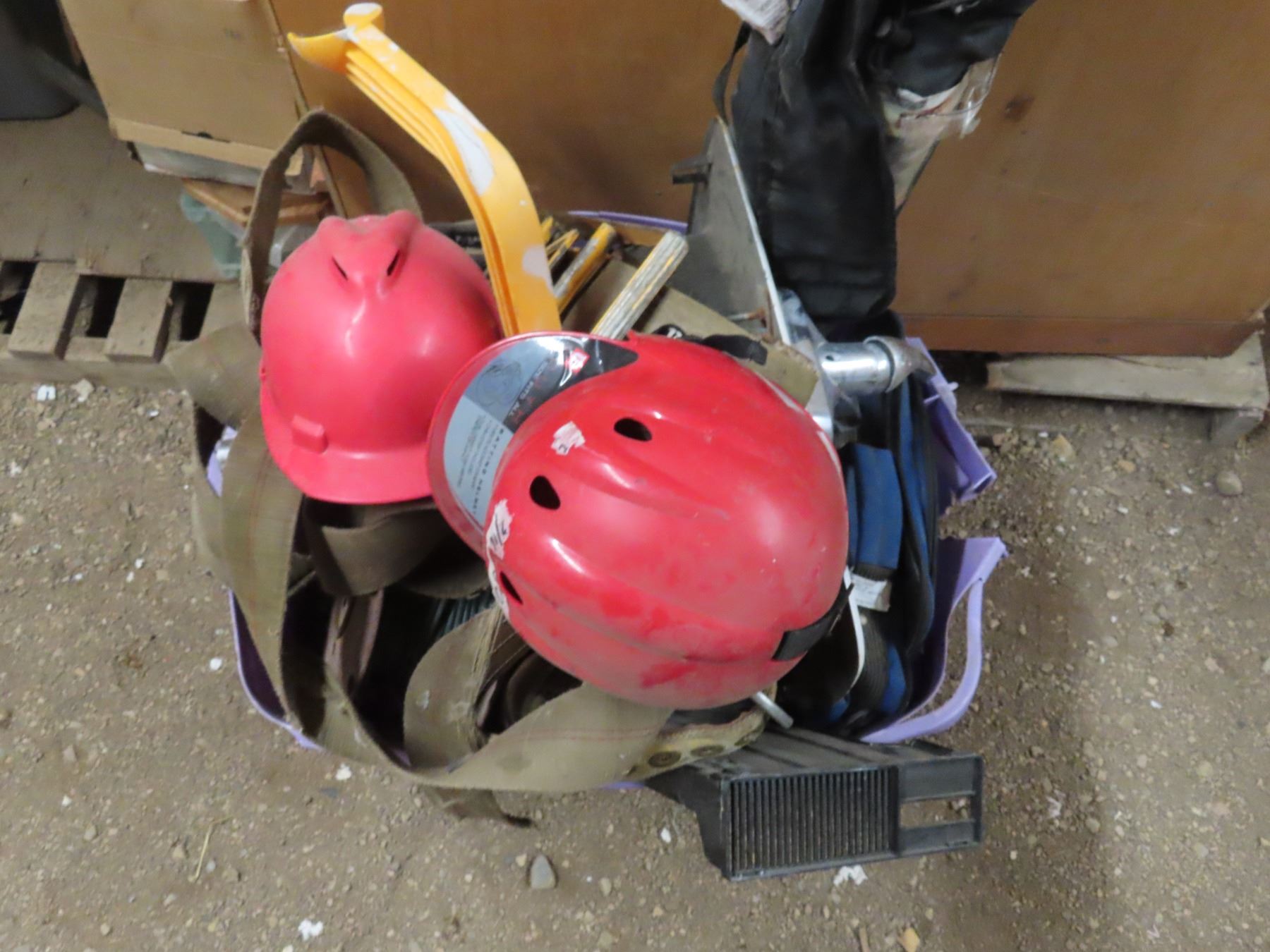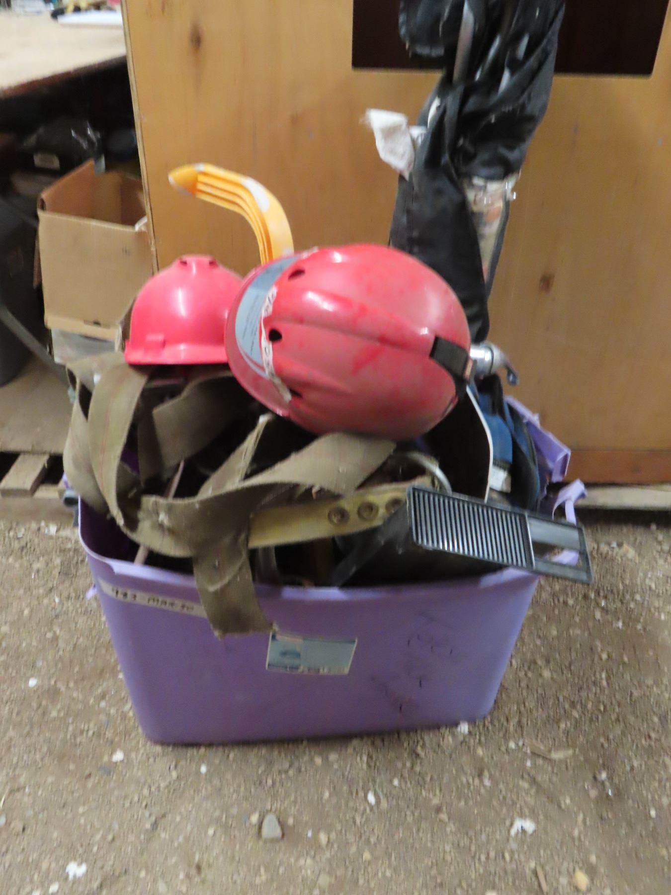 tote contains hardware , seat belt kits , long strap , baseball helmet , bag of drywall screws , size 11 Dakota wok boots and assorted hardware , folding chair , safety helmet