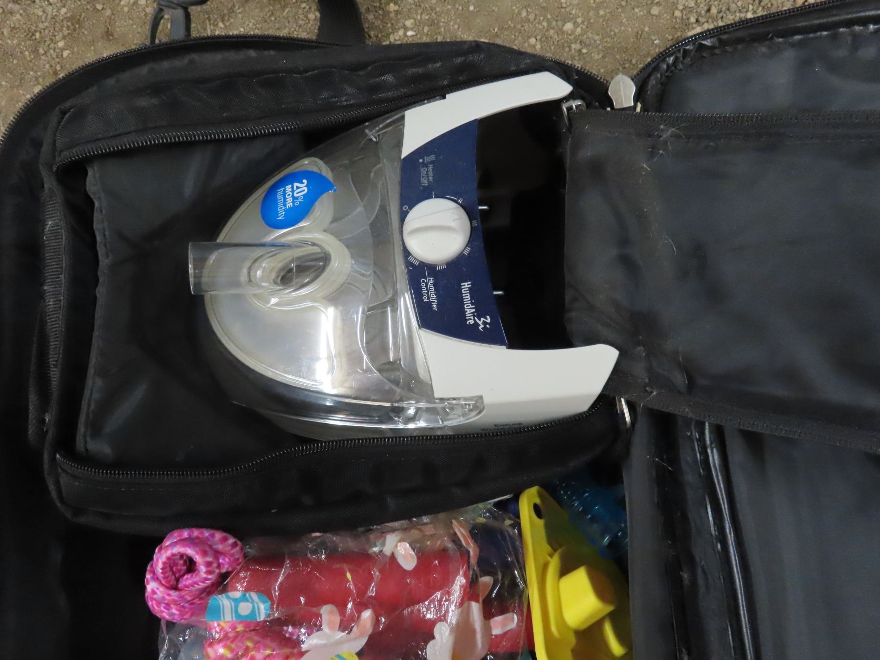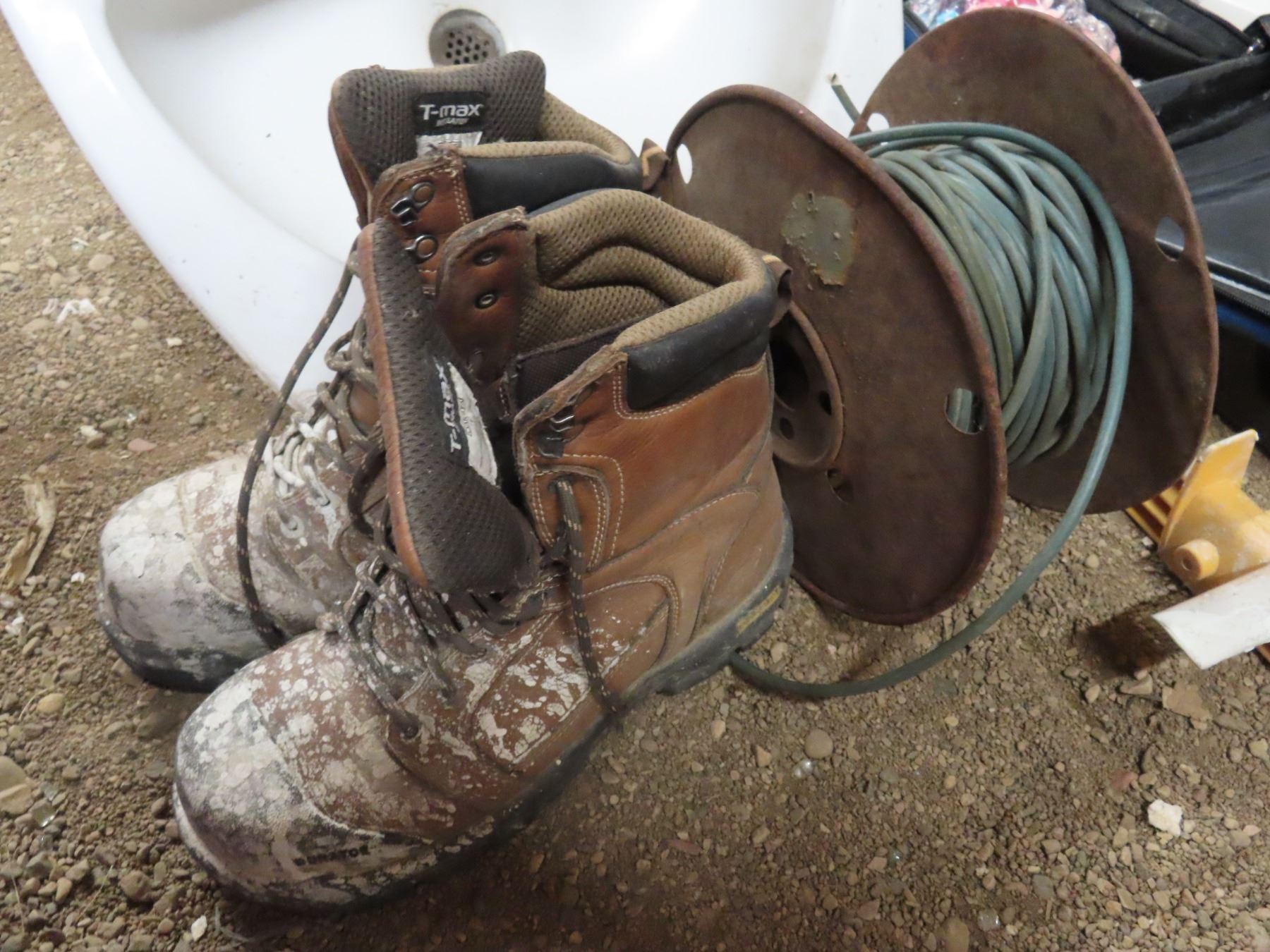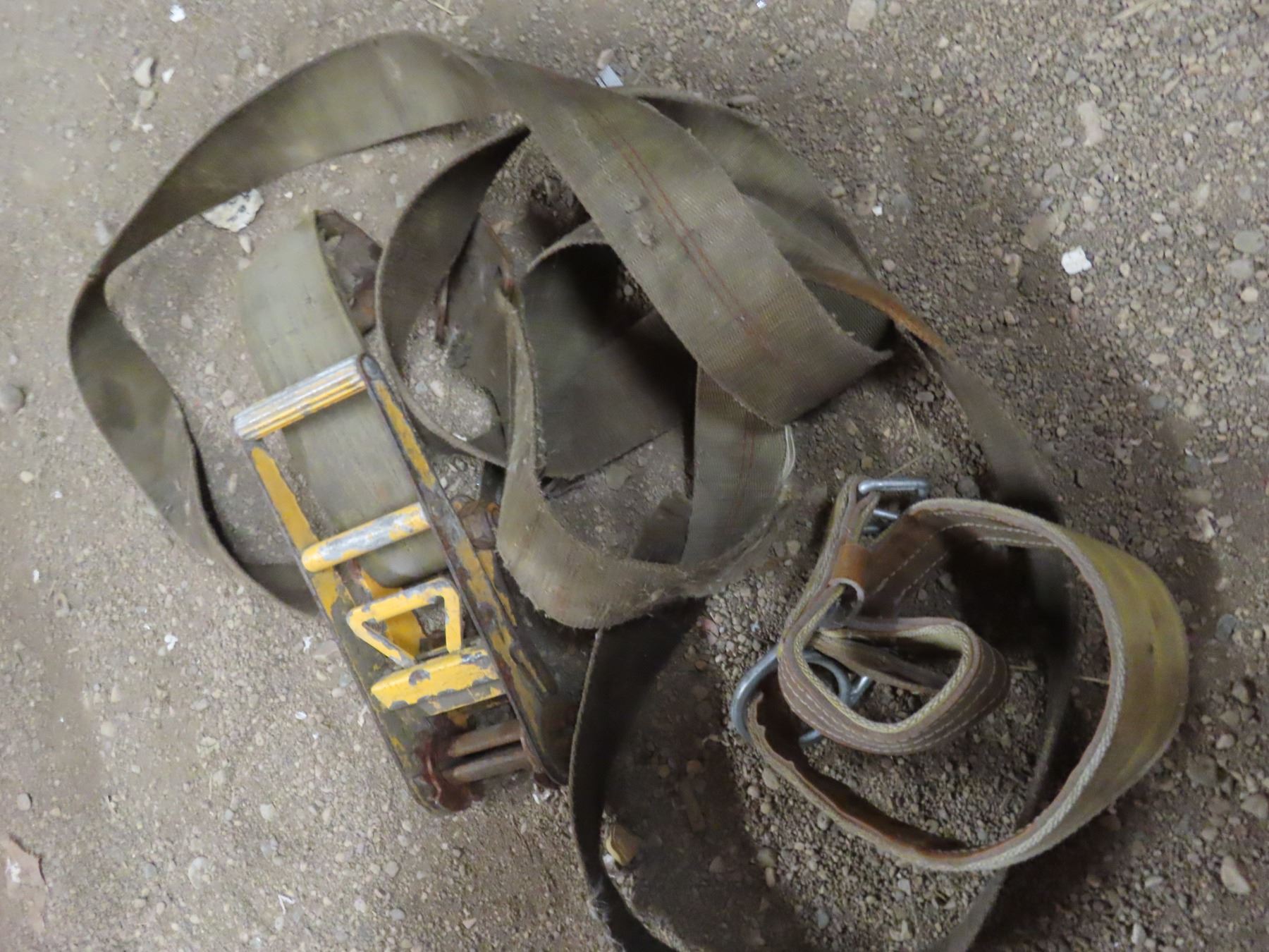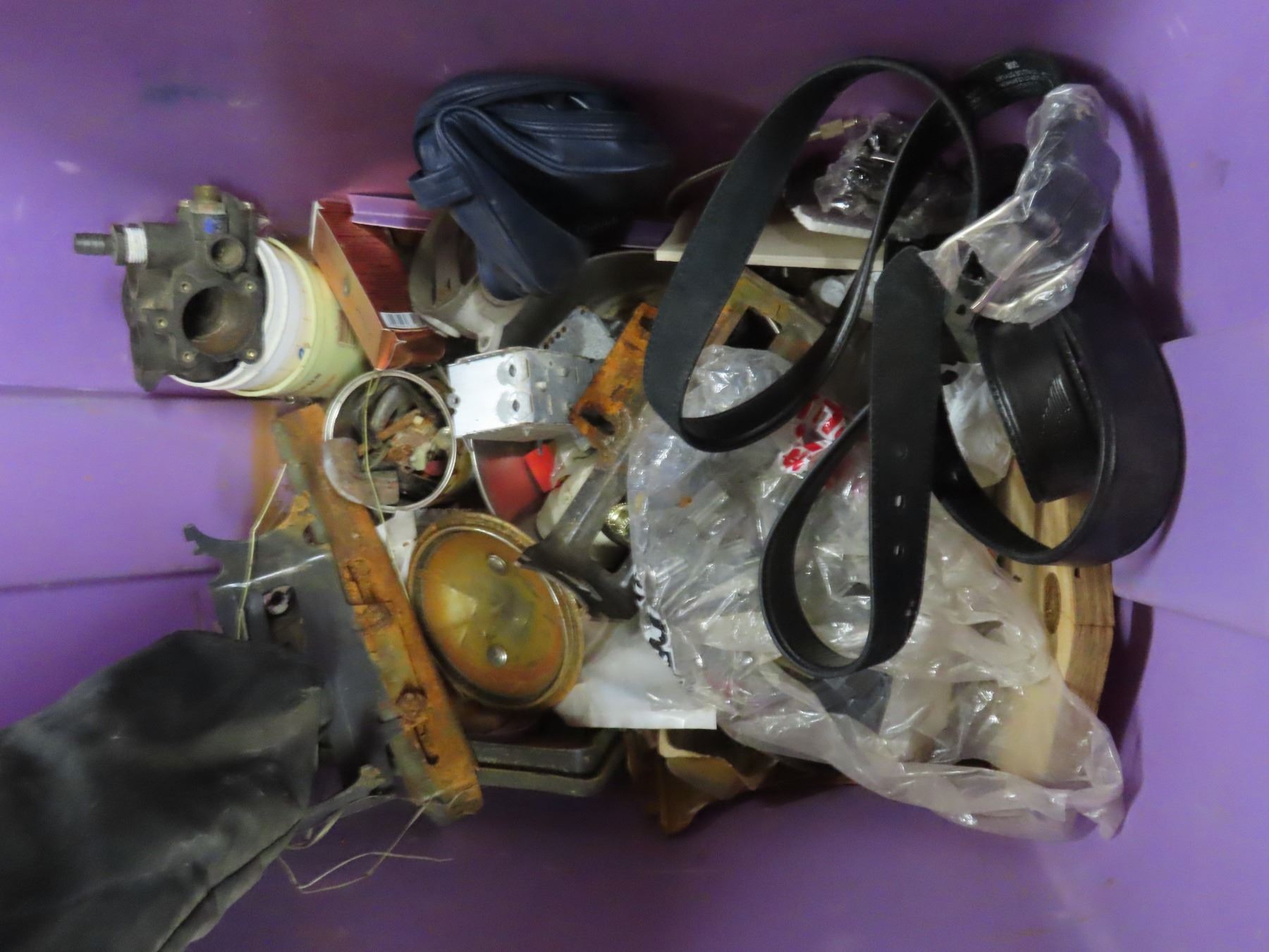 tote contains hardware , seat belt kits , long strap , baseball helmet , bag of drywall screws , size 11 Dakota wok boots and assorted hardware , folding chair , safety helmet