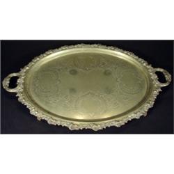 Large twin handled oval silver plated tray, the rim moulded with flowers and the centre chased with leaves, 77cm in length