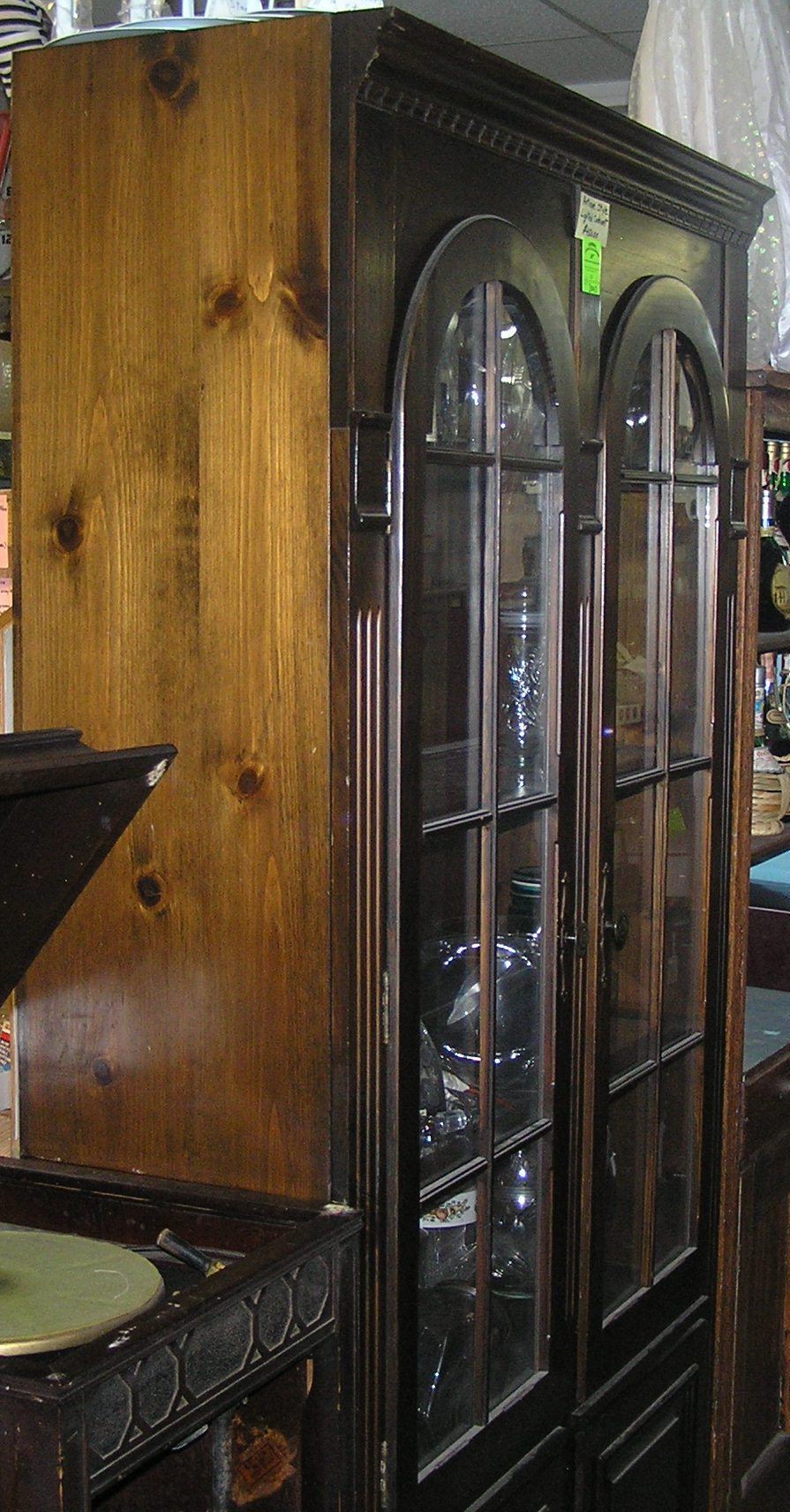 Large two door walnut illuminated china cabinet with lower two door storage area 44’’ wide by 14’’ deep by 80’’ high est. value $400.00-$600.00