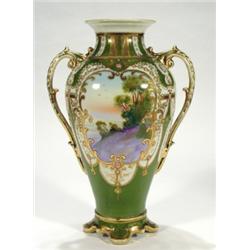 Large two handled Noritake vase, hand painted with panels of landscape scenes and flowers onto a green ground, marks to base, 39cm high