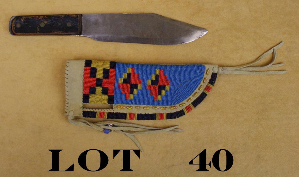 Large unmarked camp type knife and beaded leather scabbard; knife is approx. 14” overall with an approx. 9” blade with three riveted leather scales in overall good condition showing some nicks from use at thefront tip area; the scabbard is of more recent vintage, approx. 10” x 4” and beautifully beaded on the front panel in yellows, blues, oranges and blacks with a trim of multi-colored individual beads alongthe bottom of the scabbard and a couple large multi-color beads hanging from thongs at the throat of the scabbard. Est.: $200-$400.