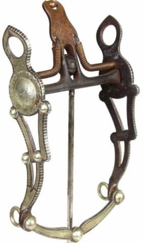 Large unmarked spade bitwith inlayed silver cheek plates and slobber bar, copper wrapped braces and engraved copper spade, cheeks 8 1/4", very good overall condition. Est. 250-450