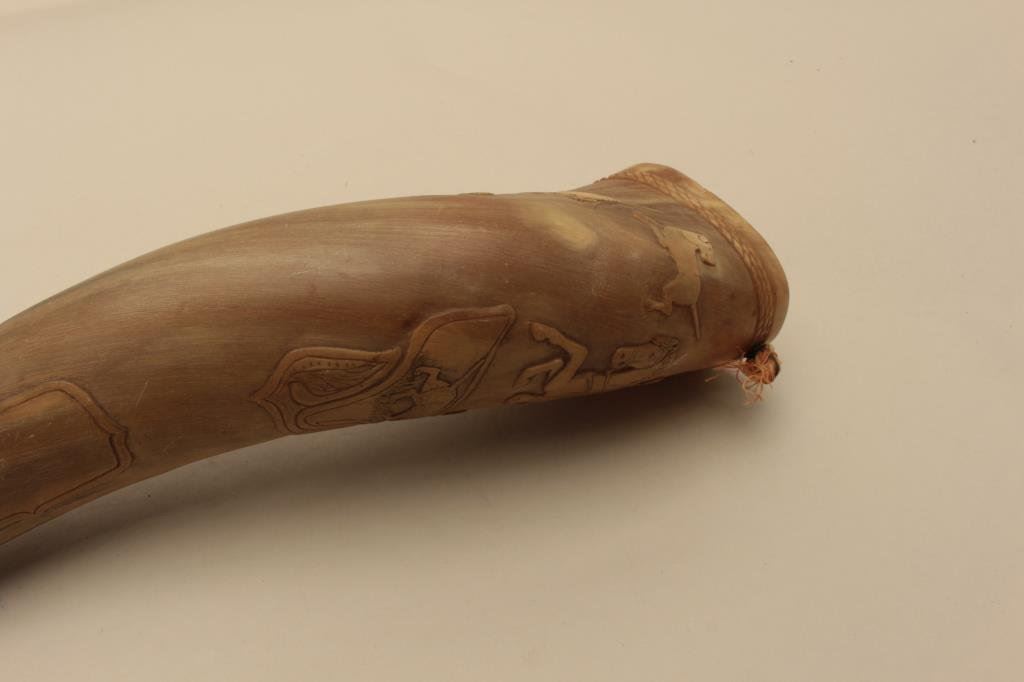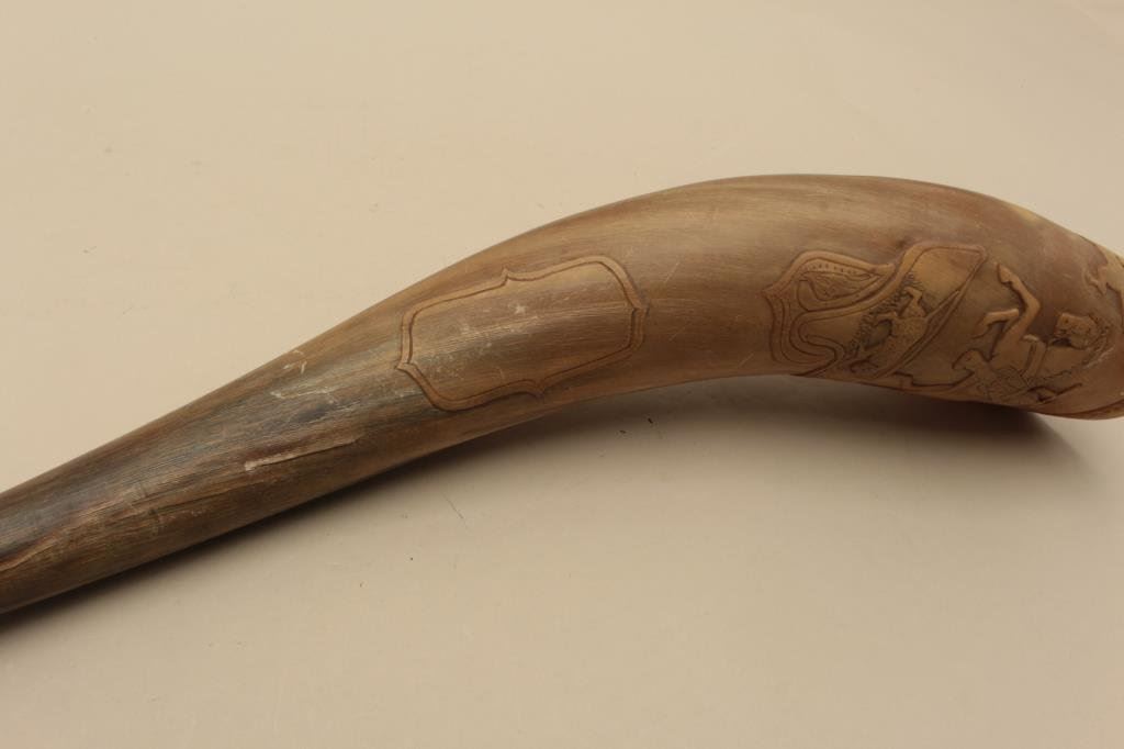horn is approximately 21” overall and nicely accomplished with carvings of a hunter on horseback with hunting horn and dogs. Est.: $500-$1,000.