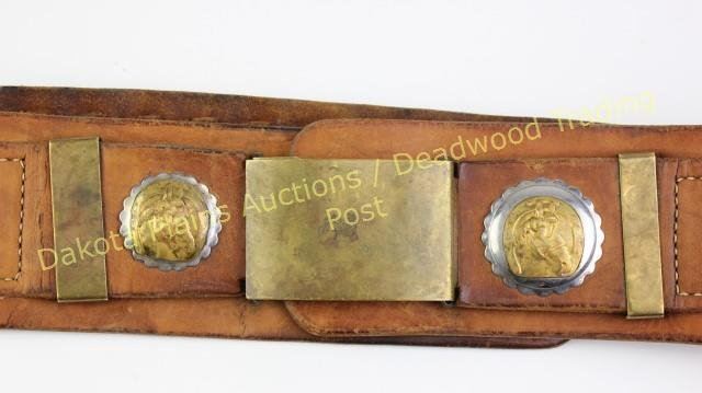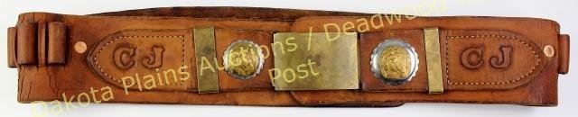 with brass buckle plate and horse head conchos marked with CJ, fits 36" waist. Est. 100-250