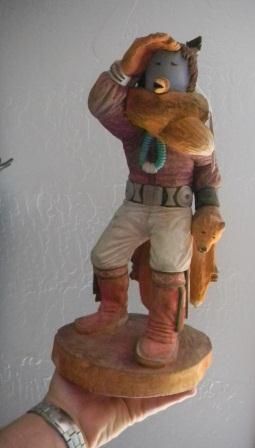 Large Zuni Kachina signed by Frank Gene Zuni Edgewater Clan as well as being engraved in the wood, dated 1993, and sold for $1500. in 1993. The doll is 16 x 7x 7 inches. Extremely finely carved, rare Zuni Kachina, the feathers on the top have been broken, otherwise condition good. Please note the artist actually carved the necklace, bracelet and concho belt. Shipping $25.00