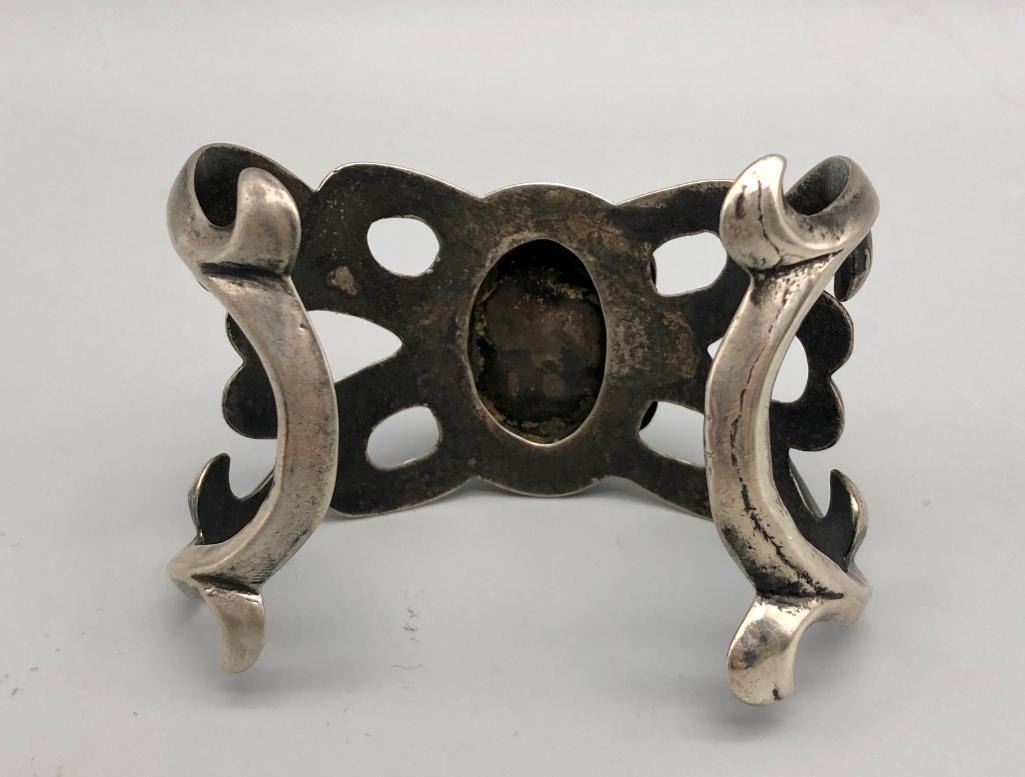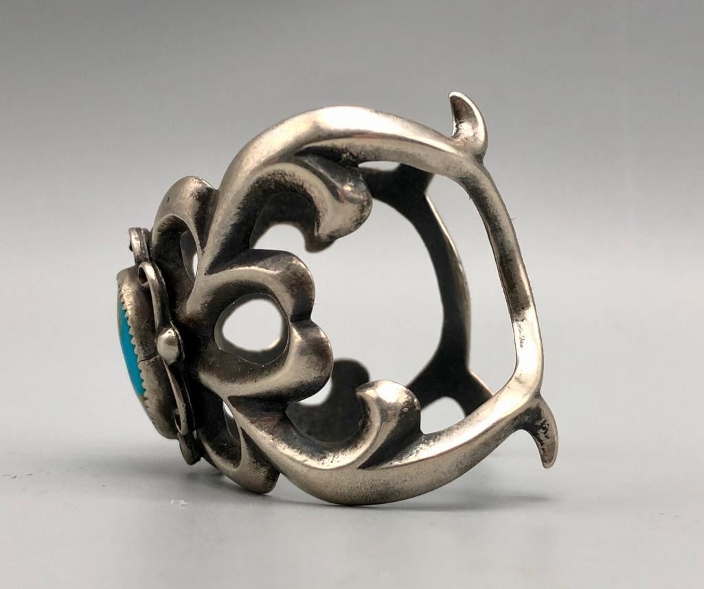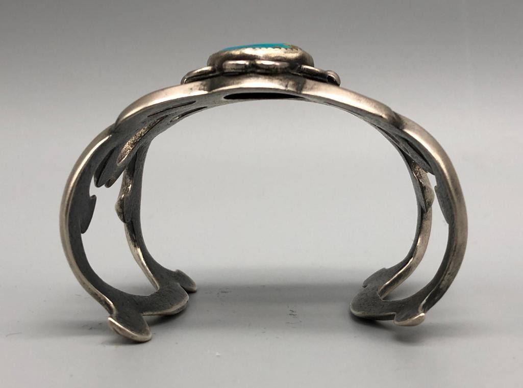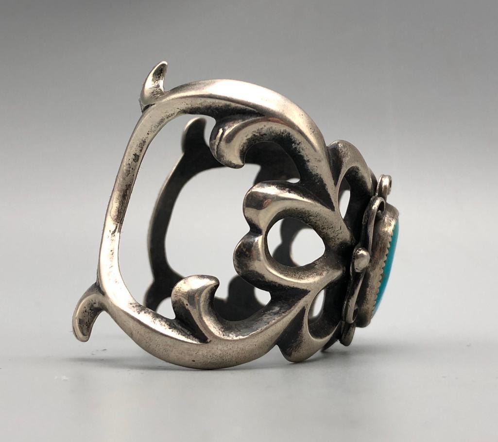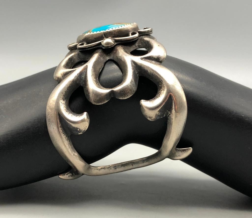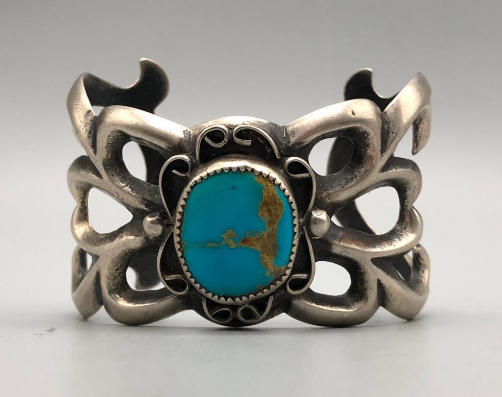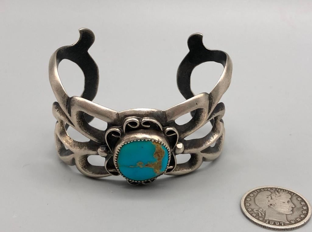 Up for consideration is a larger turquoise sandcast bracelet. This is an elegant bracelet that is set with a beautiful turquoise stone with silver wire scroll accents. It is mounted on an elegant sandcast bracelet. It is made from sterling silver. MAKER: Unmarked. APPROX AGE: Vintage. SIZE: Inside circumference measures 5-1/4 inches long. Opening is an additional 1-1/4 inch, fitting a 6-1/2 inch wrist. Width is 1-3/4 inches. Weighs 78.9 grams. CONDITION: Good for its age, normal wear expected. Please look closely at the pictures as they are an important part of our description and are hereby incorporated into the description, specifically with regards to condition. SHIPPING: There will be a $5 handling / packaging fee for shipping this lot. The actual cost of postage will be added on top of that. BUY IT NOW: If you would like to buy this item now, without waiting for the auction day to bid on it, we do offer this option (which is available up to 48 hours before the actual auction starts). The “Buy it Now†price is the high estimate of this lot (plus applicable fees and the Buyer's premium is discounted to 10% when using the Buy it Now option). If you would like to exercise this option, you must contact us by email (or phone as long as you talk to someone live). Reference this lot number and your intention to "Buy it Now."