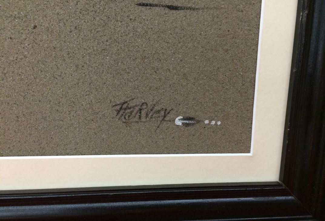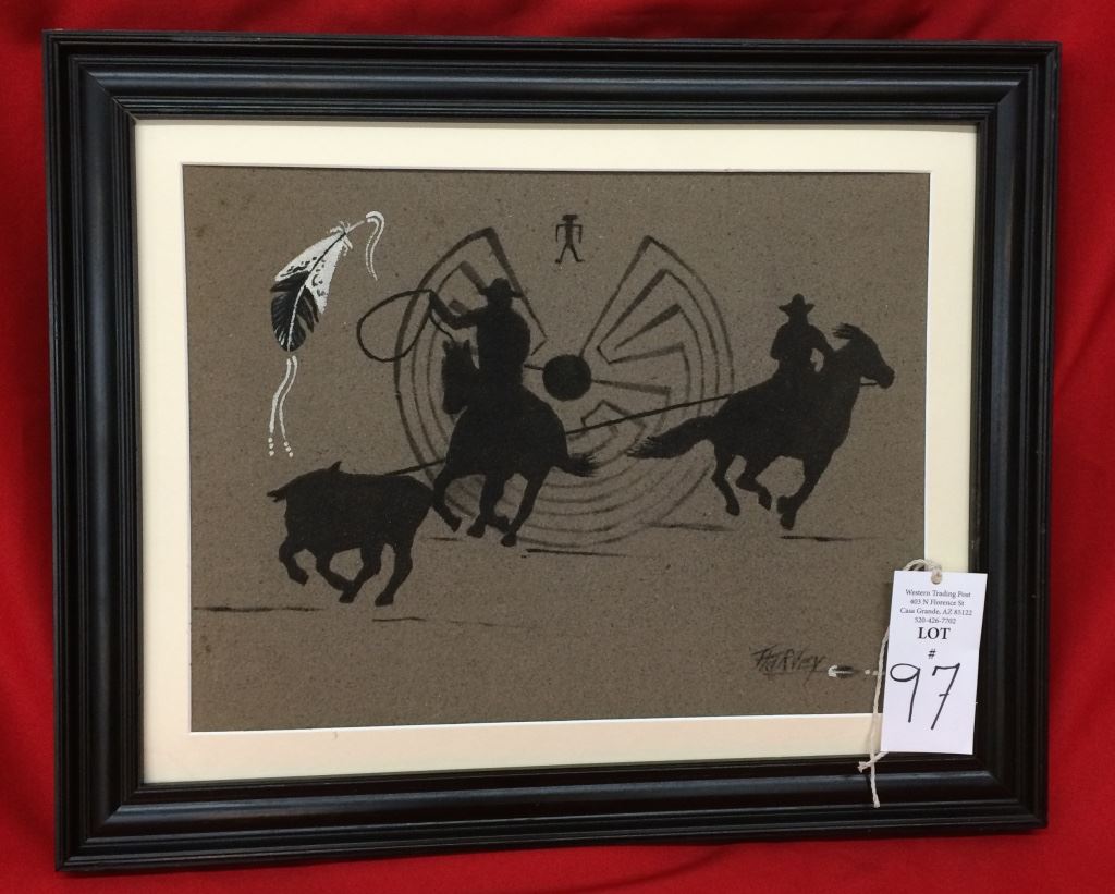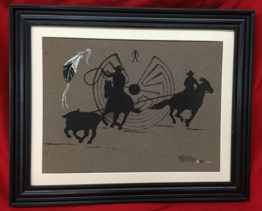 This Sandpainting is much larger that the standard. It is unique with a couple of team ropers and a Man-in-the-Maze design in the background. It measures 21” X 17” including the frame and is signed. Good condition.