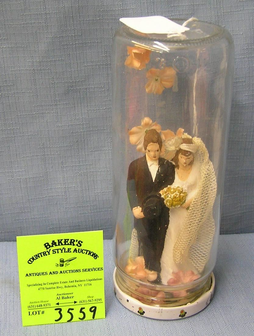 Larger hand painted chalkware bride and groom figure in encased glass jar est. value $40.00-$60.00