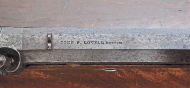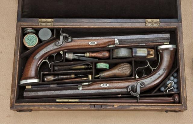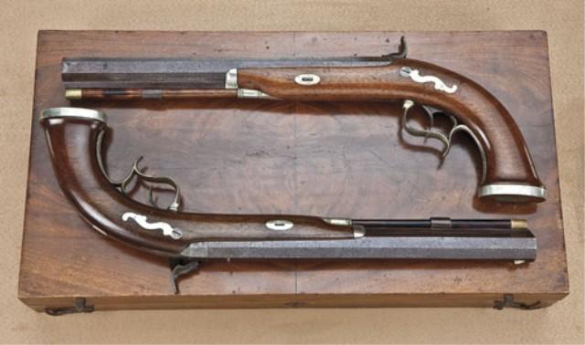 Largest known pair of American dueling pistols signed John P. Lovell, Boston, .52 caliber smoothbore. Approx. 13” heavy octagon barrels, 19-1/4” overall. German silver mounts, brown barrel, case hardened locks and breeches, with fancy German Silver sideplate, circa approx. 1840. The pair remain in original very good plus condition, with 30-50% original brown on barrels, some spotting, just beginning erosion and pinprick pitting. Locks and tangs show 50-70% case hardening that is drifting and dulling slightly, but still some areas of rainbow color showing, particularly on the tangs. One stock is very good plus showing 90% original varnish, just some minor scratches, minor marks. The mate shows a repair at the wrist and some light refinishing at the back end and about good overall. The pair are contained within their original to the period brownish velveteen-line partition style case. The case remains in good to very good condition with some slight edge wear, some minor fraying, some indentations ant contact points but at least very good overall. The case retains its original mold, flask, screwdriver, nipple wrench, rods, cap tins, worms, key, powder measure, oil bottle, and oth