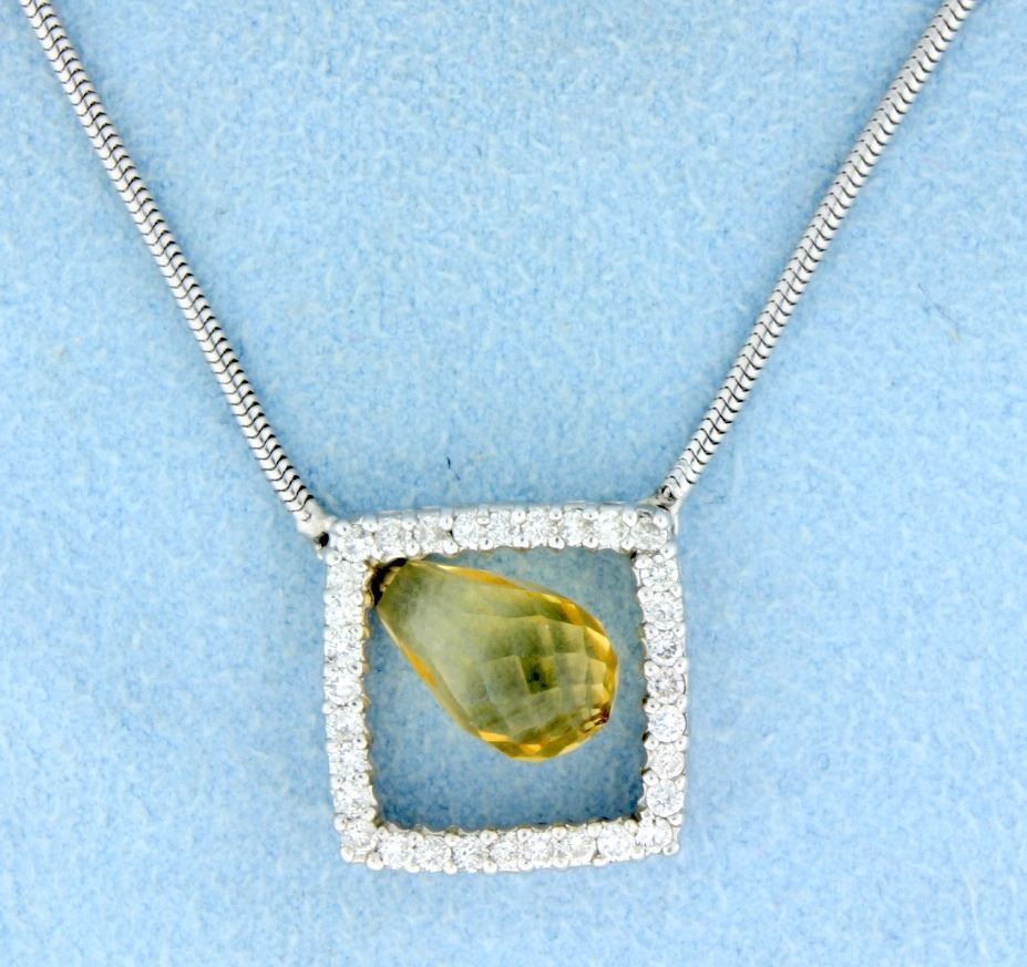 Gorgeous 14k white gold Lariat Diamond Necklace with a Citrine Brillion Cut drop. There are 28 brilliant cut, very white, diamonds that weigh 0.56 carats and are SI-VS clarity and G-H color. On the end is a very fine gem quality Brillion cut Citrine with many facets. 9.6g