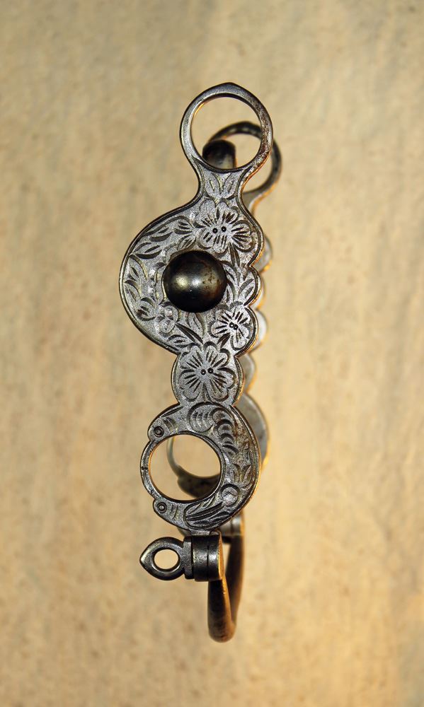 Early unmarked Larios deeply engraved iron kissing bird bit with tall half breed mouthpiece and original cricket.