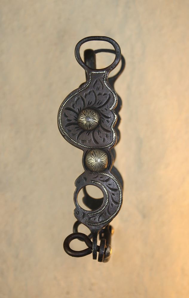Very early kissing bird bit with deeply engraved silver domes and silver inlaid rope in typical Larios style, with half breed and original cricket.