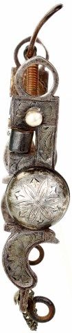 showing nice condition, great old bit fully engraved with large dome conchos lead filled, cheek plates 7" long X 6 1/4" wide, original chains and hangers intact. 600-1200