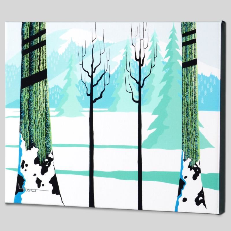 Larissa Holt, a student of distinguished artist Eyvind Earle(1916-2000), uses bold colors and breathtaking scenery to create images of Nature in her own unique style. "Winter" is a limited edition giclee on stretched canvas by Holt, numbered and bearing Holt's authorized signature. This piece comes gallery wrapped. Includes Letter of Authenticity. Measures approx. 12" x 10" x 1.5" (image). This item requires special handling and may have a longer than usual turnaround.