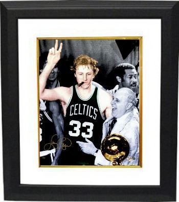 Larry Bird was more than just "the hick from French Lick." During his 13 years as a Boston Celtic he was the 1980 Rookie of the Year, a 12-time NBA All-Star and scored more than 21,000 career points. In addition to leading the Green and White to three championships, Bird was co-captain of the first U.S.A. Dream Team and led them to Olympic gold in 1992. Bird retired in 1992 and was inducted into the Basketball Hall of Fame in 1998. Larry Bird hand signed this 'Cigar' celebration Spotlight 16X20 photo w/NBA trophy and Red Auerbach. Limited Edition of 33 signed in Gold. A Steiner Hologram and Certificate of Authenticity is included. Custom White Mat and Premium Black Color Framed as shown.