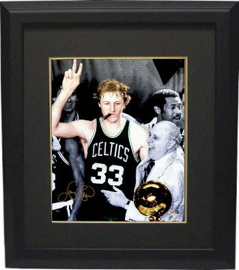 Larry Bird was more than just "the hick from French Lick." During his 13 years as a Boston Celtic he was the 1980 Rookie of the Year, a 12-time NBA All-Star and scored more than 21,000 career points. In addition to leading the Green and White to three championships, Bird was co-captain of the first U.S.A. Dream Team and led them to Olympic gold in 1992. Bird retired in 1992 and was inducted into the Basketball Hall of Fame in 1998. Larry Bird hand signed this 'Cigar' celebration Spotlight 16X20 photo w/NBA trophy and Red Auerbach. Limited Edition of 33 signed in Gold. A Steiner Hologram and Certificate of Authenticity is included. Custom Black Mat and Premium Black Color Framed as shown.