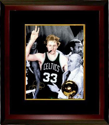 Larry Bird was more than just "the hick from French Lick." During his 13 years as a Boston Celtic he was the 1980 Rookie of the Year, a 12-time NBA All-Star and scored more than 21,000 career points. In addition to leading the Green and White to three championships, Bird was co-captain of the first U.S.A. Dream Team and led them to Olympic gold in 1992. Bird retired in 1992 and was inducted into the Basketball Hall of Fame in 1998. Larry Bird hand signed this 'Cigar' celebration Spotlight 16X20 photo w/NBA trophy and Red Auerbach. Limited Edition of 33 signed in Gold. A Steiner Hologram and Certificate of Authenticity is included. Custom Black Mat and Premium Mahogany Color Framed as shown.