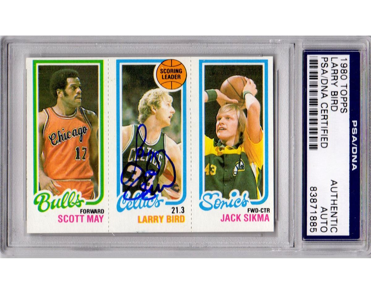 Larry Bird signed Boston Celtics 1980 Topps rookie card #30. The card has been authenticated and slabbed by PSA/DNA and the number can be verified online. Authenticated and autographed Rookie cards are hard to come by and are an increasingly rare and valuable collectible.