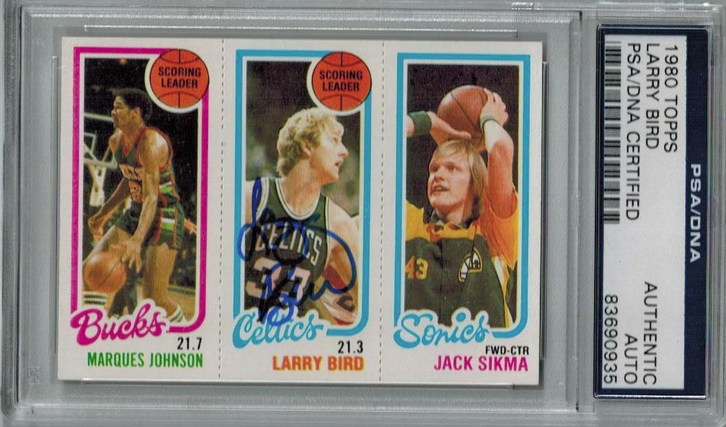 Larry Bird signed Boston Celtics 1980 Topps rookie card #30. The card has been authenticated and slabbed by PSA/DNA and the number can be verified online. Authenticated and autographed Rookie cards are hard to come by and are an increasingly rare and valuable collectible.