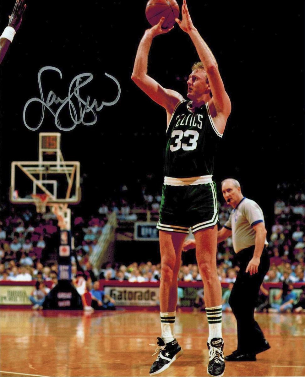 Larry Bird signed Boston Celtics green jersey jump shot action 8x10 photo. Item comes with the Larry Bird personal tamper-proof hologram and Schwartz Sports Memorabilia tamper-proof numbered hologram which can be verified online.