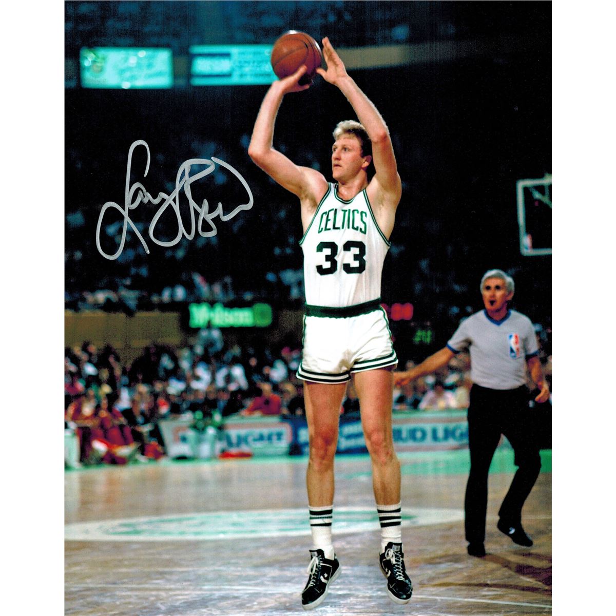 Larry Bird signed Boston Celtics jump shot action 8x10 photo. Item comes with the Larry Bird peronal tamper-proof hologram and Schwartz Sports Memorabilia tamper-proof numbered hologram which can be verified online.