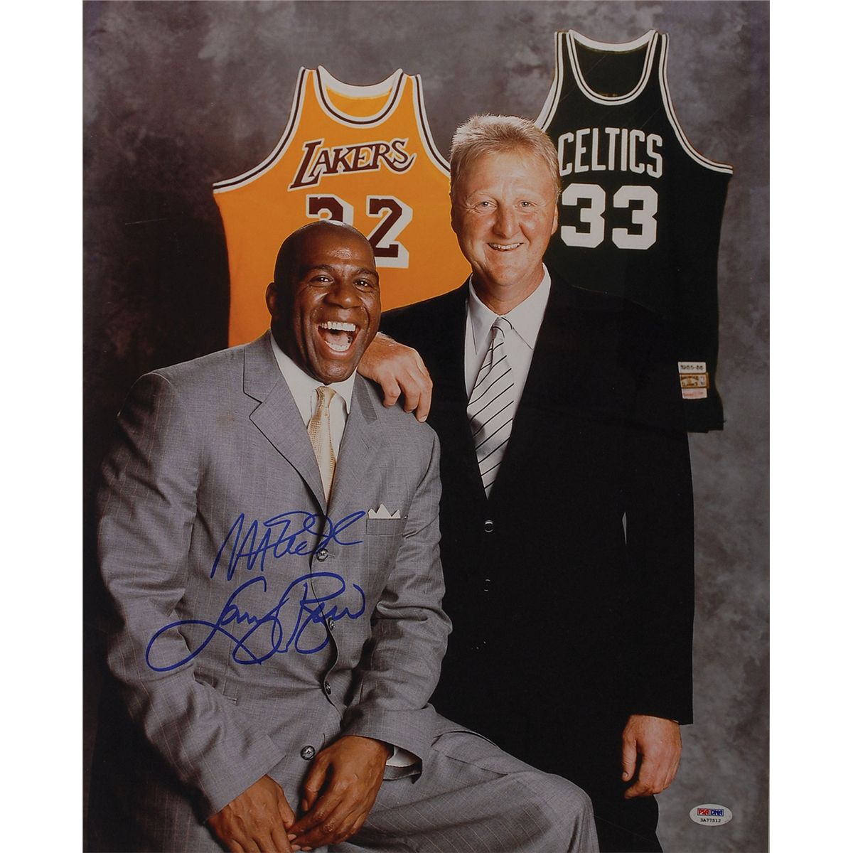 Color satin-finish 16 x 20 photo of Bird and Johnson posing in front of their old jerseys, signed in blue felt tip by both. Rolled and in fine condition, with a PSA/DNA label affixed to the lower right corner. Accompanied by a certificate of authenticity