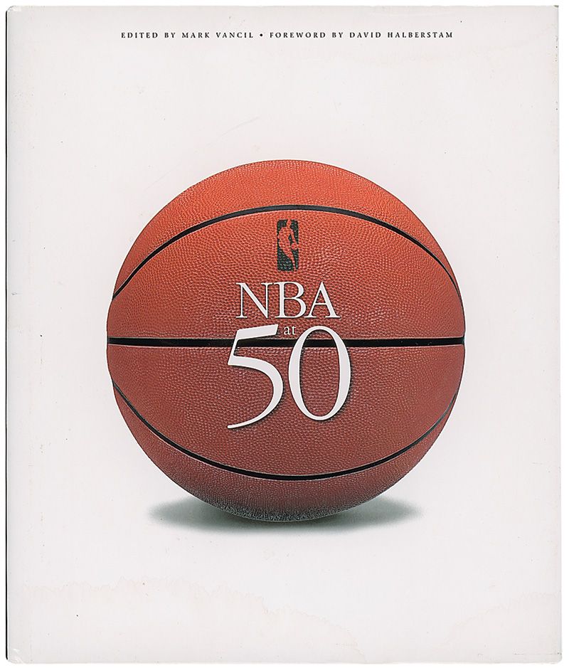Signed book: The NBA at 50. First edition. NY: Park Lane Press, 1996. Hardcover with dustjacket, 10.5 x 12.25, 240 pages. Signed in black felt tip on the reverse of the front free end page, and numbered 165/250. In fine condition, with light damp staining, soiling, and impressions to the dustjacket.