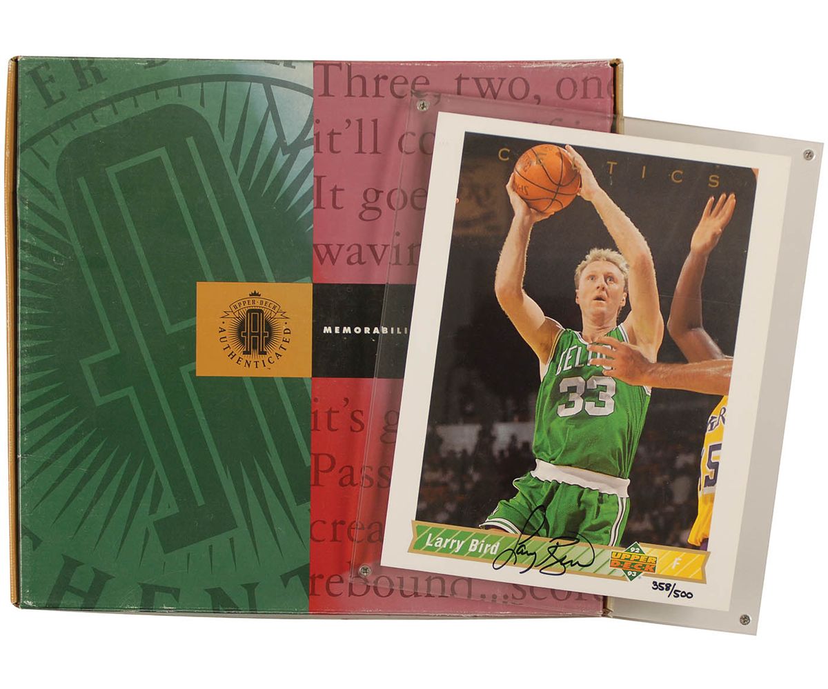 Limited edition ‘blow up’ of Bird’s 1992–93 Upper Deck trading card, 8.5 x 11, numbered #358/500, signed at the bottom in black felt tip. In fine condition, with a UDA authentication label affixed to the reverse. Accompanied by a certificate of authenticity from Upper Deck.