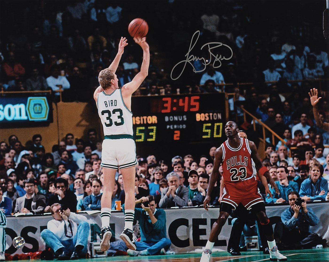 Color satin-finish 20 x 16 full-length photo of Larry Bird rising up for a jump shot as Chicago Bulls legend Michael Jordan looks on, signed in silver ink by 'Larry Legend.' In very fine condition, with an authenticity label affixed to lower left corner.