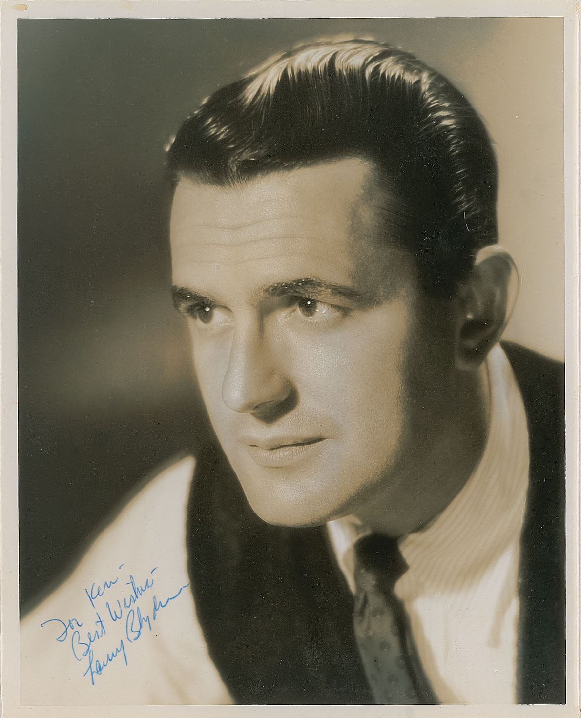Vintage glossy 8 x 10 close-up photo of Blyden in 1962, signed and inscribed in blue ballpoint, "For Ken—Best wishes—Larry Blyden.” In very good to fine condition, with a few small creases and light overall curling. On June 6, 1975, Blyden died in a car crash at the age of 49 while vacationing in Morocco, just twenty-four days before the premiere of his new game show, Showoffs.