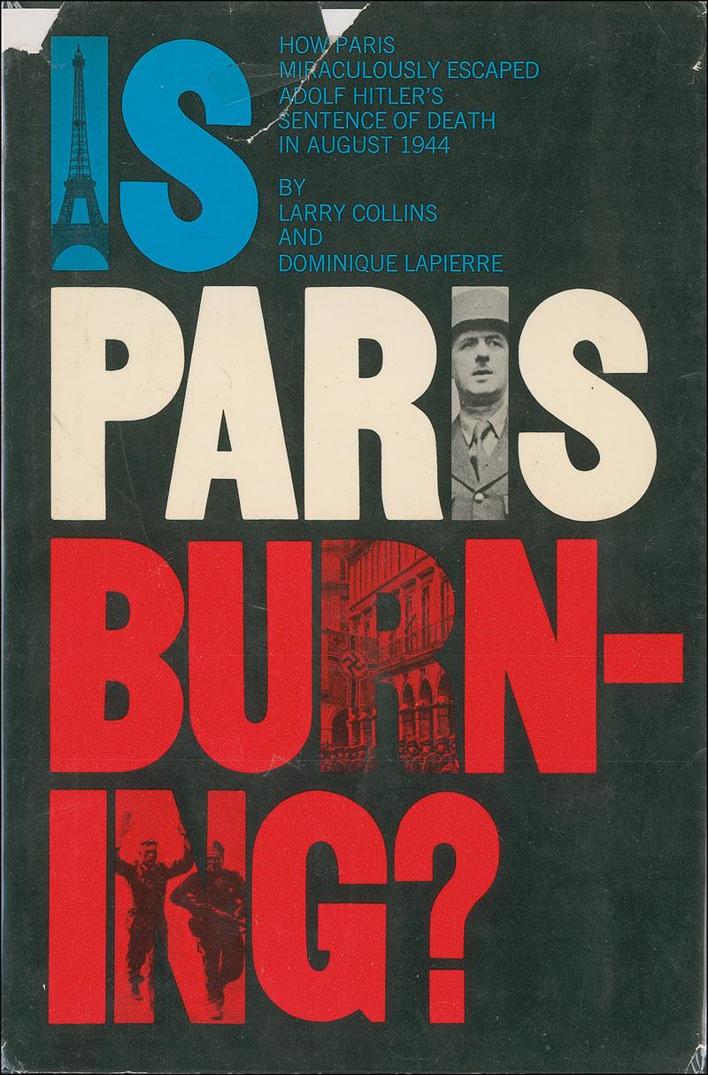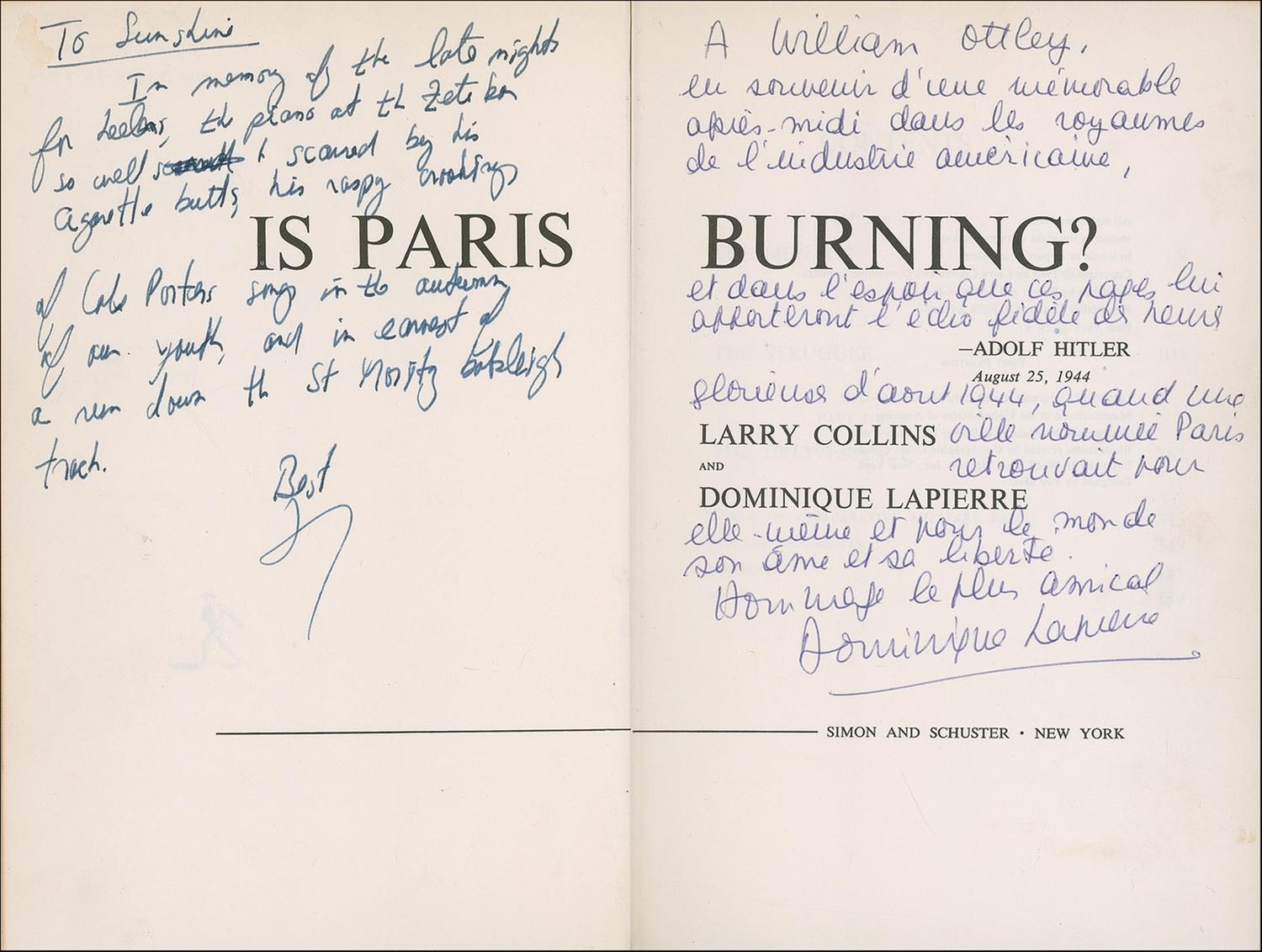 Signed book: Is Paris Burning? First edition, first printing. NY: Simon & Schuster, 1965. Hardcover with dustjacket, 6.5 x 9.5, 376 pages. Both have signed and inscribed in blue ink (LaPierre in French) on the title page. In fine condition, with the dustjacket rating very good with tears and missing paper along the top and to the spine.