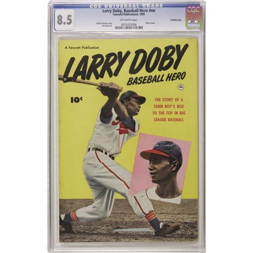 <B>Larry Doby, Baseball Hero #nn - Crowley Copy pedigree (Fawcett, 1950) CGC VF+ 8.5 Off-white pages.</B></I> A photo cover and a back cover photo pin-up of the baseball star wrap this book which features Bill Ward art. Overstreet 2006 VF 8.0 value = $481; VF/NM 9.0 value = $761. CGC census 10/06: 1 in 8.5, none higher.<BR><BR><b>Shipping:</b> Slabbed Comic (<a target="_blank" href="http://www.heritageauctions.com/common/shipping.php">view shipping information</a>)