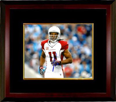 Larry Fitzgerald with the third overall pick in the 2004 NFL Draft by the Arizona Cardinals and he has played his entire professional career for the team. He has been selected for the Pro Bowl seven times, and currently ranks fifth all-time in NFL history in receiving yards per game for a career, behind Calvin Johnson, Andre Johnson, Torry Holt, and Marvin Harrison. On November 24, 2013, at 30 years and 85 days of age, he became the youngest NFL receiver to reach 11,000 career receiving yards, surpassing the previous record-holder, Randy Moss. He agreed to an eight-year, $120 million contract extension on August 20, 2011. Larry Fitzgerald has hand signed this Arizona Cardinals 8x10 Photo. Certificate of Authenticity from Athlon Sports. Custom Black Mat and Premium Mahogany Color Framed as shown.