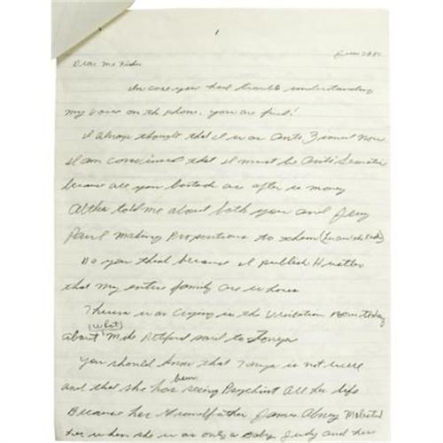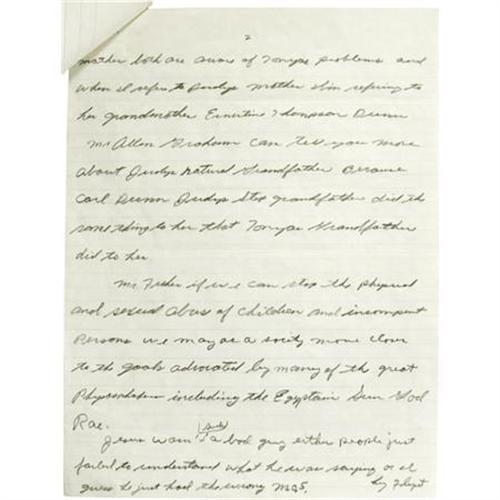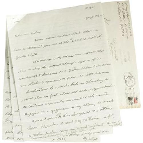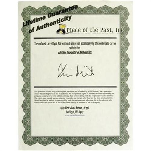 <B>Larry Flynt Handwritten Letters.</B></I> Written during Flynt's 1984 incarceration for desecration of the flag (after infamously wearing Old Glory as a diaper to one of his many trials), the letters are part diatribe and part memoir from the ever-outspoken Flynt. Written to his attorney at the time, the second letter opens with "In case you had trouble understanding my voice on the phone, you are fired!" and ends with his opinions on everything from his daughter's alleged sexual abuse to his personal thoughts on religion. Another provocative read from Mr. Flynt. The two letters (three pages, total) are signed by Flynt, written in pencil, and accompanied by the original mailing envelope. In Very Fine condition with age-toning and visible mailing creases. <I>Accompanied by certificate of authenticity</B></I>. <I>Accompanied by LOA from PSA/DNA.</B></I><BR><BR><b>Shipping:</b> Flat Material, Small (<a target="_blank" href="http://www.heritageauctions.com/common/shipping.php">view shipping information</a>)