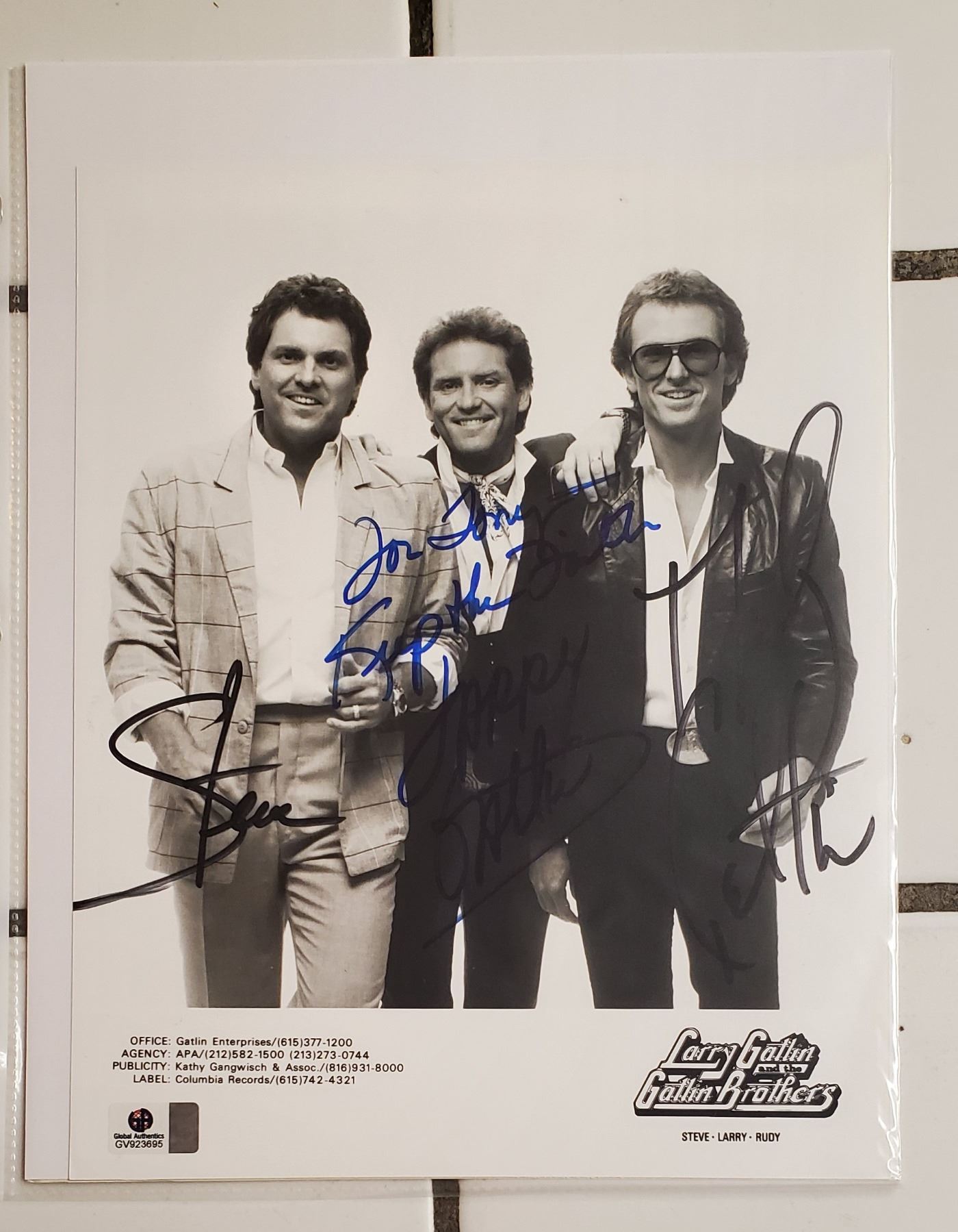 An 8” x 10” photograph signed by Larry, Steve, and Rudy Gatlin. Global Authentics authenticated the autograph, providing a COA numbered GV 923695.