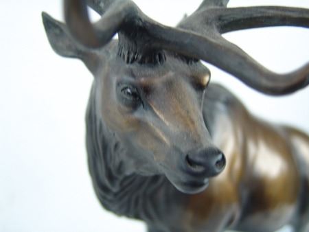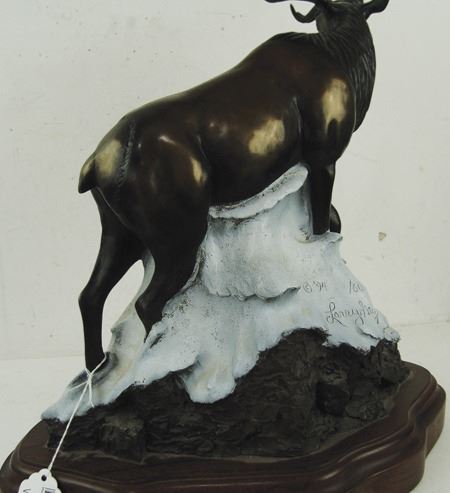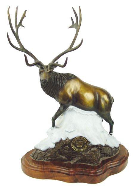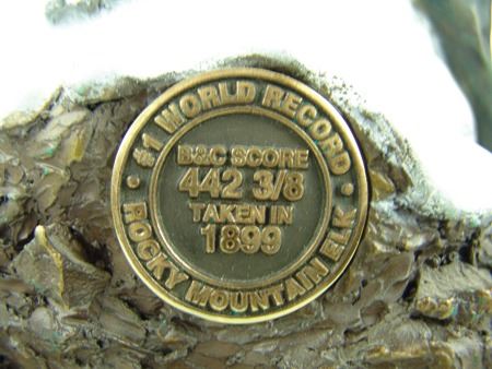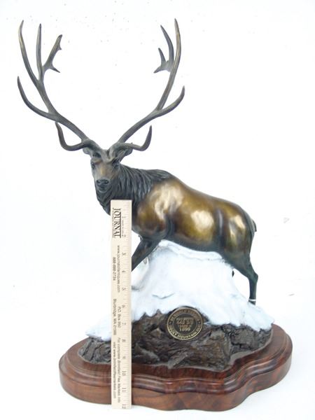 Ca. 1994, Large limited edition (#16/60) bronze sculpture of the world record Rocky Mountain elk that was taken in 1899; it scored 442-3/8. Excellent condition. 21-1/4" x 15" x 8"