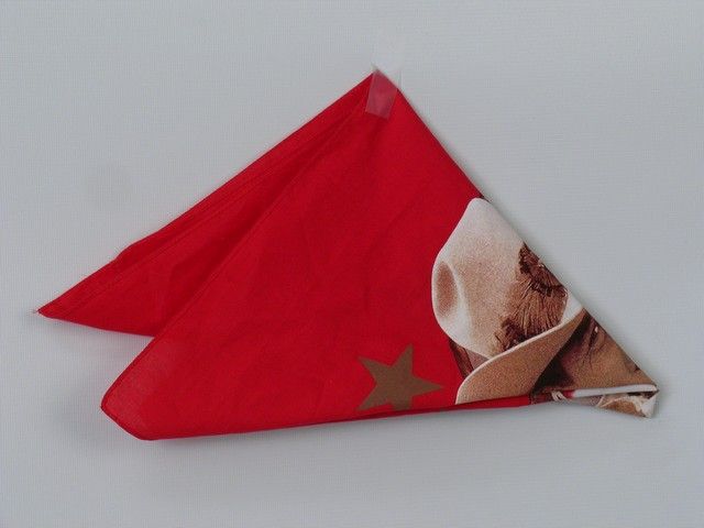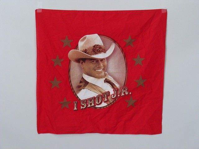 From one of the most watched shows in TV history, the shooting of J.R. on "Dallas", this is a red handkerchief with photo of Larry Hagman and the words "I Shot J.R., which comes from the Larry Hagman estate.
