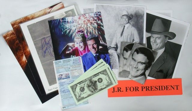 A spectacular collection of promotional Items which come directly from Larry Hagman's Estate. They include nine press photos, 2 8x10 of Larry Hagman with a saddle, 2 8x10 of Larry Hagman with Text Star, 2 8.25x11.75 of J.R. and Sue Ellen (Linda Gray), 1 photo of "I Dream of Jeannie" with co-star Barbara Eden, 2 Larry Hagman cards); a 1991 People Magazine, signed by Larry Hagman, 2 "J.R. for President" bumper stickers; 13 Larry Hagman / J.R. Funny Money - one is signed by Larry Hagman, and Hagman's Canadian Sport Fishing License!