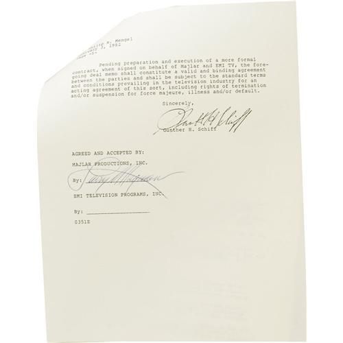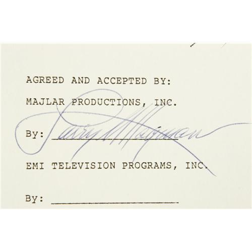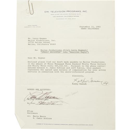 <B>Larry Hagman Signed "Deadly Encounter" Contract Archive.</B></I> Includes a contract for the 1982 made-for-TV thriller signed by Hagman, Susan Anspach's unexecuted contract for the movie, a test DVD (one of only two ever struck, a copy of the shooting script, publicity stills and color slides with negatives, press clippings, and a promotional brochure for the movie. Items are in overall Very Fine condition with mild wear.<BR><BR><b>Shipping:</b> Flat Material, Large (<a target="_blank" href="http://www.heritageauctions.com/common/shipping.php">view shipping information</a>)