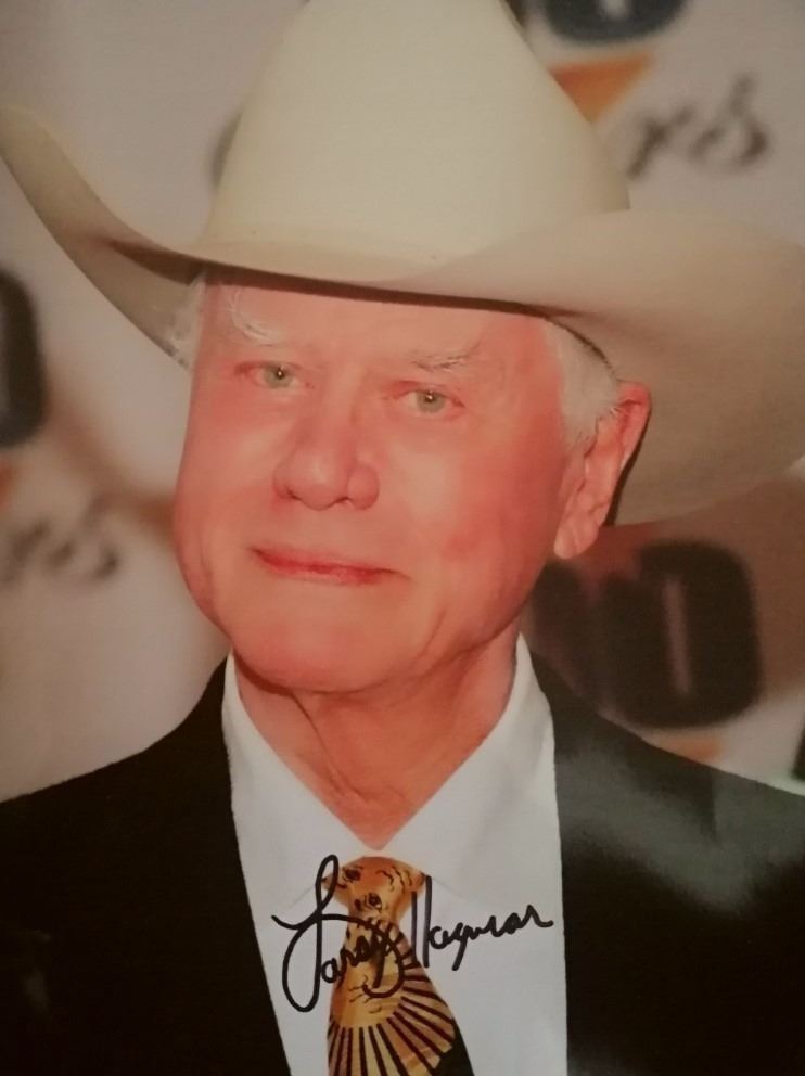 A signed photo of Larry Hagman measuring 10.75x8 inches. Supplied with coa.