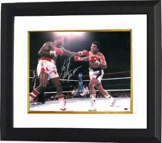 Larry Holmes' left jab is considered one of the greatest weapons in the history of sports. He was the WBC Heavyweight Champion from 1978 to 1983, The Ring Heavyweight Champion from 1980 to 1985, and the IBF Heavyweight Champion from 1983 to 1985. He made twenty successful title defenses. Holmes won his first forty-eight professional bouts, including victories over Ken Norton, Muhammad Ali, Gerry Cooney, and Tim Witherspoon. He is frequently ranked by many boxing experts as one of the greatest heavyweight fighters of all-time. Larry Holmes has hand autographed this 16x20 vs Muhammad Ali with Easton Assassin inscription. Leaf Hologram and Certificate of Authenticity from Athlon Sports. Custom White Mat and Premium Black Frame as shown.