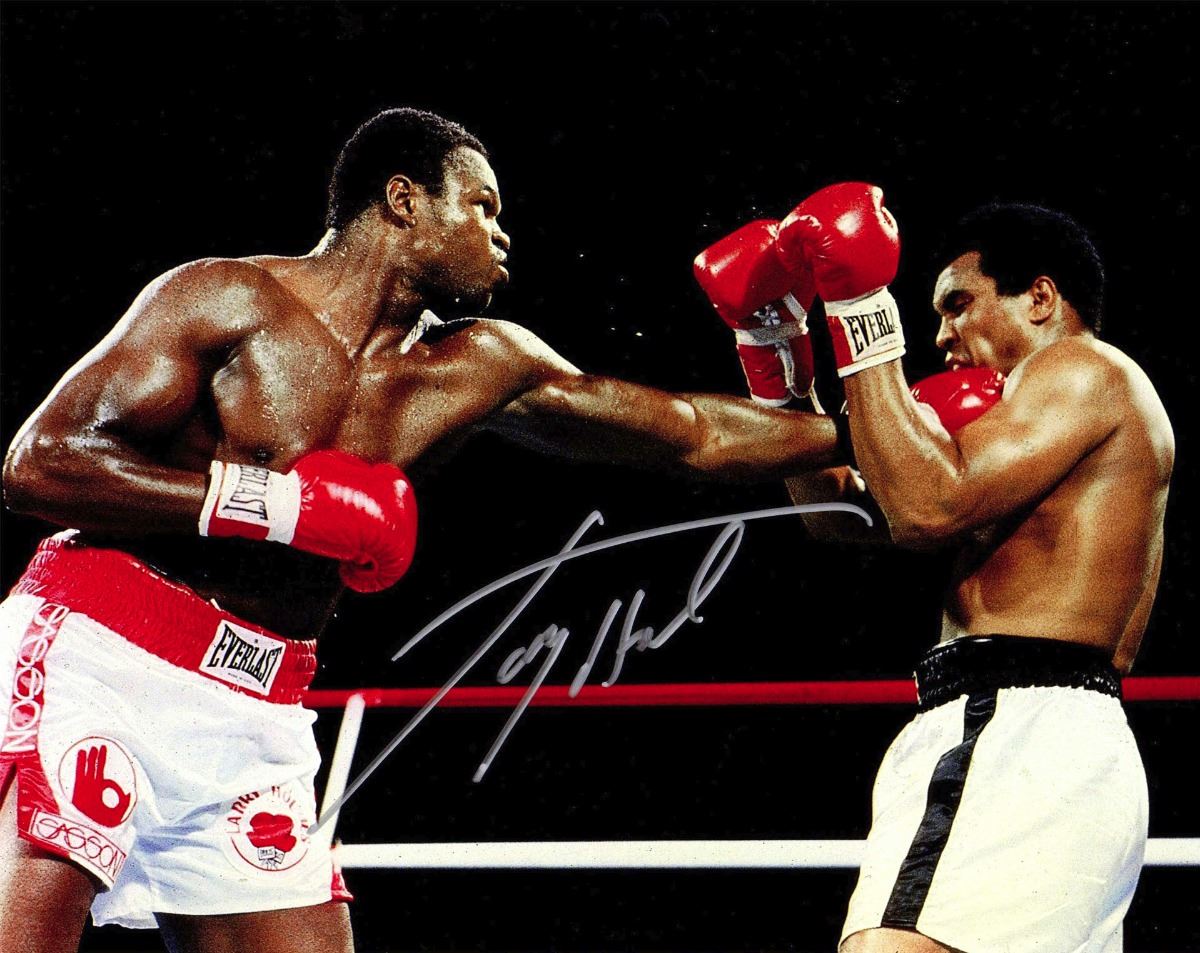 Larry Holmes signed boxing puching Muhammad Ali action 8x10 photo. Item comes with a Schwartz Sports Memorabilia tamper-proof numbered hologram and Certificate of Authenticity which can be verified online.