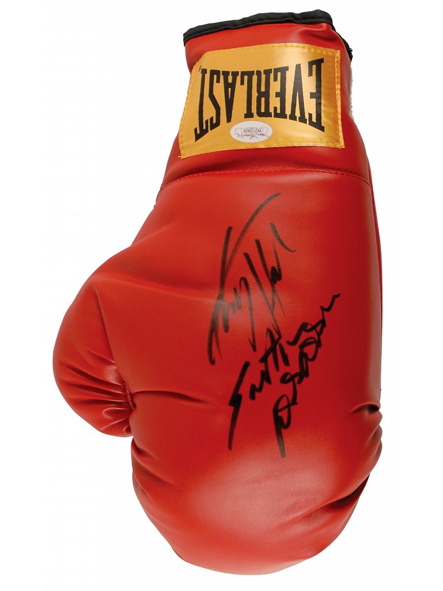 Red Everlast left-handed 14-ounce boxing glove signed in black felt tip on the top, “Larry Holmes, Easton Assassin.” In fine condition, with a JSA label affixed to the wrist.