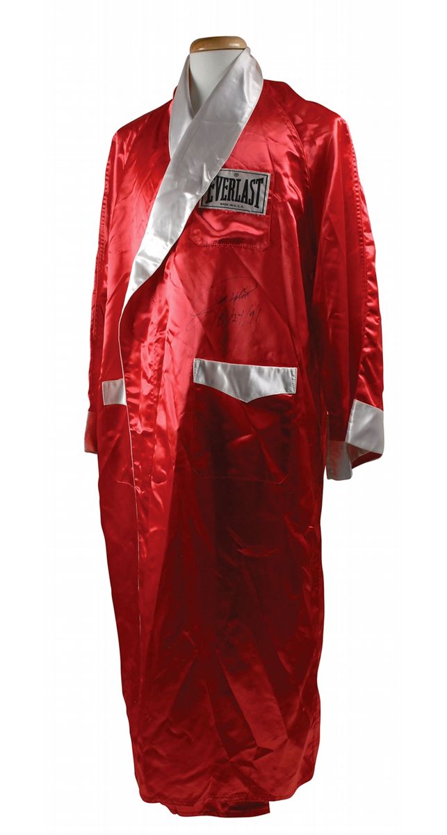 Everlast red and white boxing robe signed in black felt tip on the front, “Larry Holmes 8/27/91.” In fine condition.
