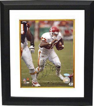 Football runs in Larry Johnson's blood. The son of Larry Johnson Sr. and brother of Tony Johnson, Larry Johnson enjoyed great success at Penn State University before being selected by the Kansas City Chiefs in the 2002 NFL Draft. He initially played in the shadow of Priest Holmes, but quickly came into his own and in 2005 rushed for 100-plus yards in nine consecutive games. He was even better in 2006, rushing for 1,789 yards and scoring 17 TDs on a NFL record 416 attempts. Larry Johnson has hand signed this 8x10 photo of him running with the ball. Steiner Hologram is included. Custom White Mat and Black Frame as shown.