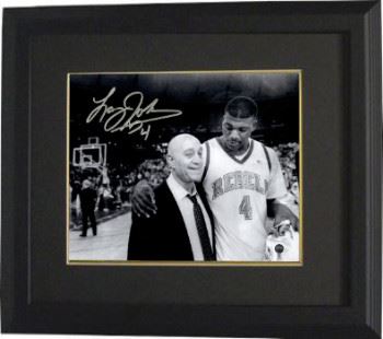 Larry Johnson played at the University of Nevada, Las Vegas to play under head coach Jerry Tarkanian. Alongside future NBA players Stacey Augmon and Greg Anthony, Johnson faced Duke Blue Devils in the title game of the 1990 NCAA Men's Division I Basketball Tournament. UNLV went on to win the contest by a score of 103–73, with Johnson contributing 22 points and 11 rebounds. The Runnin' Rebels set simultaneous NCAA records for the largest margin of victory and highest score in an NCAA Tournament championship game. Larry Johnson UNLV Runnin' Rebels has hand signed this B&W 8x10 Photo (with Jerry Tarkanian). Steiner Sports Hologram and Certificate of Authenticity. Custom Black Mat and Premium Black Color Framed as shown.